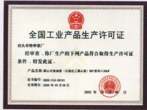 此證書為強(qiáng)制執(zhí)行標(biāo)準(zhǔn),凡生產(chǎn),銷售,使用無此證之離心熱油泵產(chǎn)品,均屬違反法令。(工業(yè)產(chǎn)品生產(chǎn)許可證編號:XK06-216-00101)