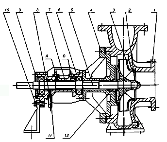 RY型熱油泵為單級(jí)懸臂式結(jié)構(gòu)分為腳支撐和中心支撐,泵的進(jìn)口為軸向吸入,出口為中心垂直向上。泵和驅(qū)動(dòng)電機(jī)通過彈性聯(lián)軸器合裝于同一底座上。整個(gè)機(jī)組無需加冷系統(tǒng)。