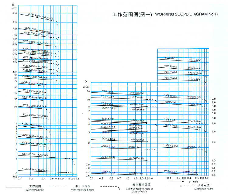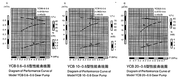 各型齒輪泵的性能參數(shù),是在介質(zhì)粘度4×10-3m2/s(40cSt)時(shí)確定的。性能參數(shù)表中給出的參數(shù)值適用于介質(zhì)粘度1×10-5~8×10-5m2/s(10~80cSt)范圍內(nèi),超出這個(gè)范圍則根據(jù)用戶提出的性能參數(shù)要求另行確定。 各型齒輪泵性能參數(shù)中給出的排出壓力是給出的大的工作壓力值,在此范圍內(nèi)泵均能正常工作,其工作范圍見圖一。