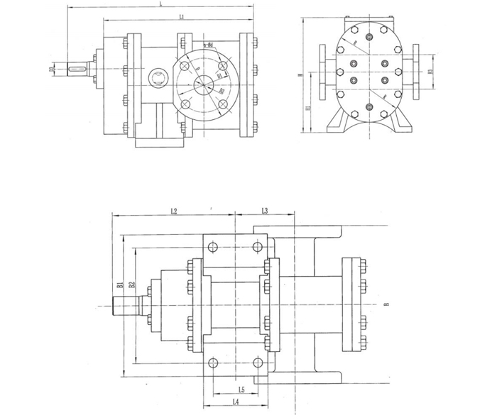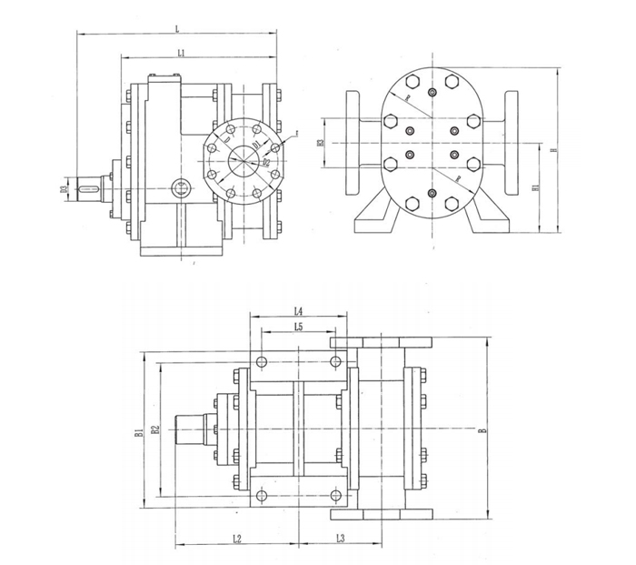 本泵采用的園周旋轉活塞式結構,轉子外徑與泵體的園周面以及轉子外徑與中間心軸園弧段在工作中與傳統的轉子泵、羅茨泵、齒輪泵的重要不同點就是實現了由原線接觸轉變?yōu)槊娼佑|,這一接觸面的重大改進,大大提高了泵的自吸性能,工作壓力和容積效率,同時也大幅度降低了泵的振動和噪音。泵的兩個轉子在工作中不參加嚙合和傳遞動力,是有按裝在軸承體內的一對高精度同步齒輪驅動,轉子采用矩點內置式和重載滾動軸承,具有強大的扭轉力矩,對提升泵的工作壓力和抗雜質能力提供了保障。泵的一對轉子有單葉和雙葉二種,單葉一般情況下用于送含有較大顆粒物料時采用,常用的是雙葉結構,可有效地降低流量脈動。